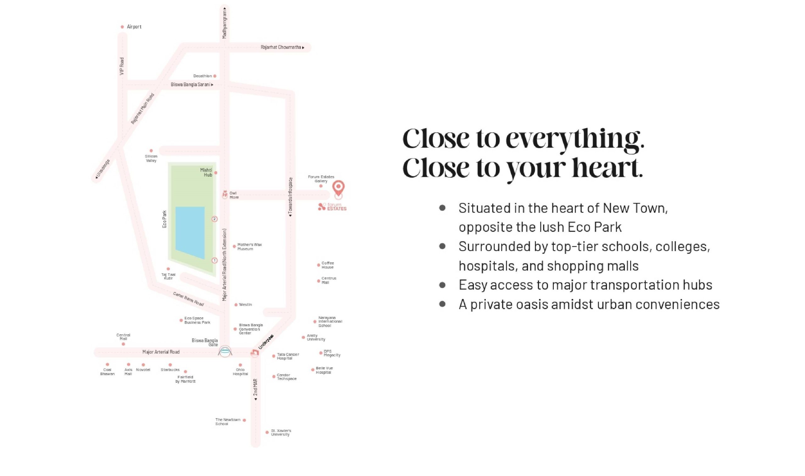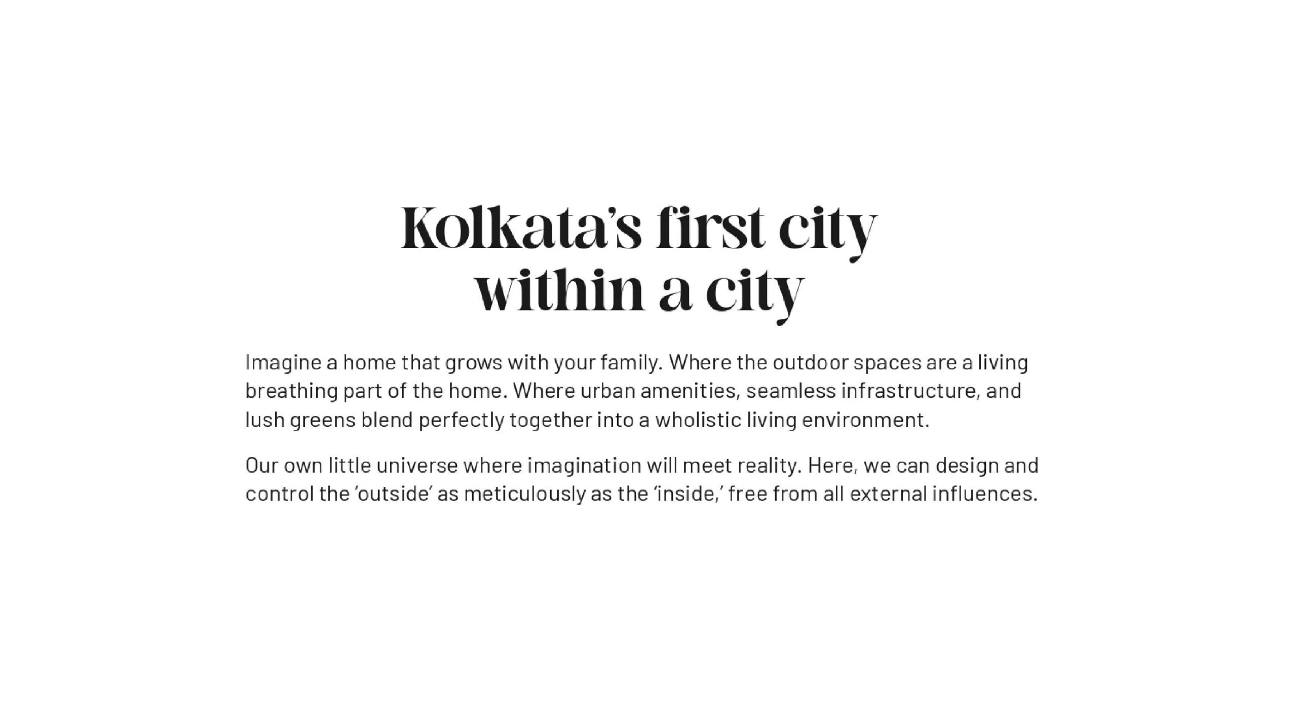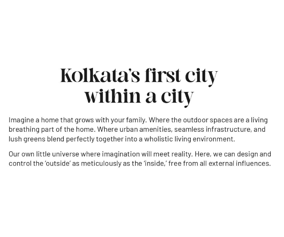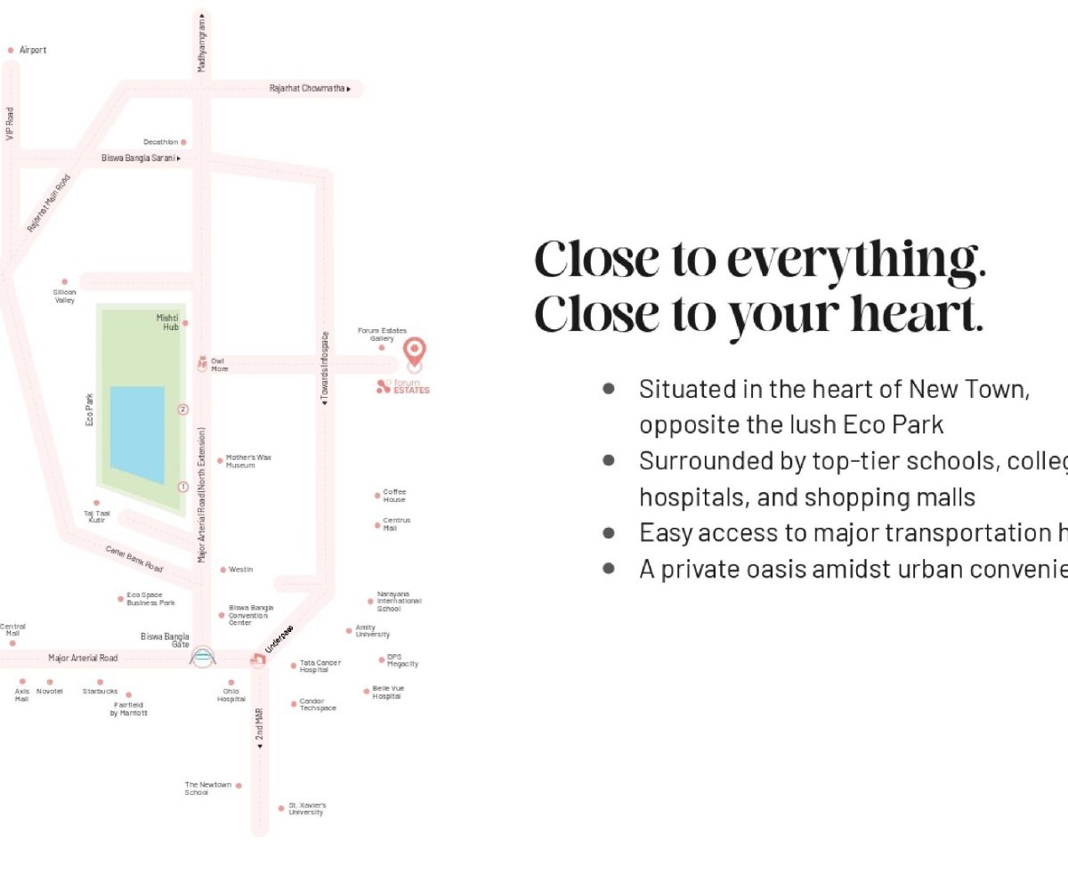 Kolkata’s first city within a city Where living, working and leisure comes together seamlessly, in a way that the whole is far greater than the sum of its parts. Nestled in the heart of New Town, forum estates will be supported by a robust 24/7 privately managed infrastructure backbone.